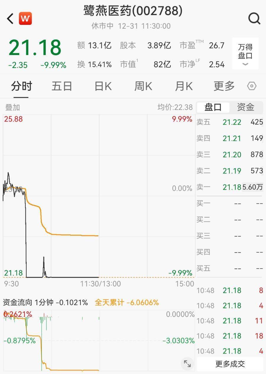 12月31日,大牛股鹭燕医药(002788.SZ)盘中跳水,1分钟直线跌停,截至午间收盘,报21.18元/股,成交金额超13亿元股票配资平台十大排名,换手率超15%。